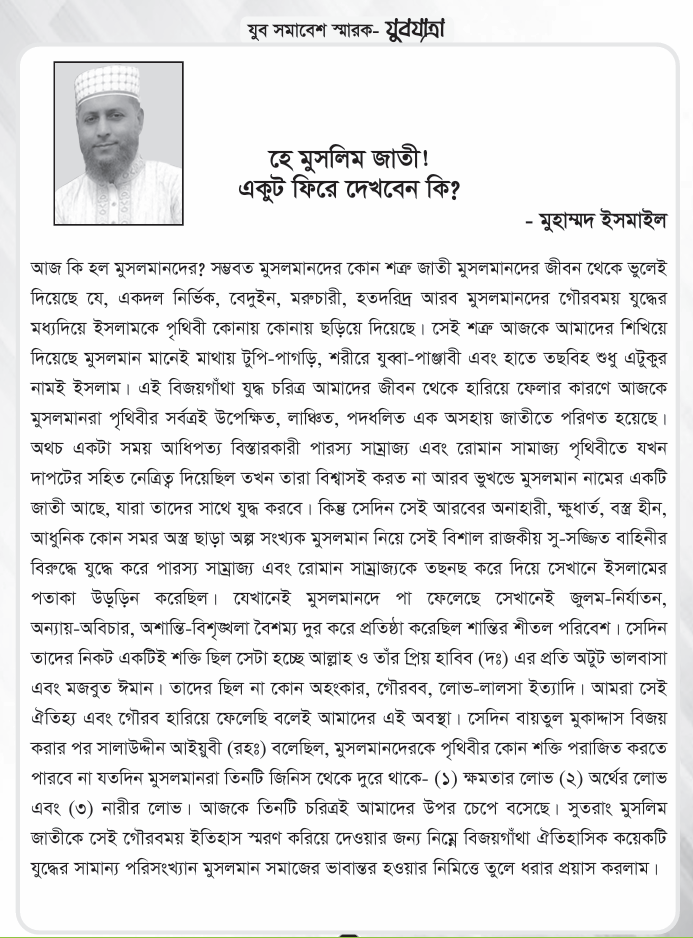 এই বিজয়মণ্ডিত যুব সমাজের চিরায় শক্তিদের জীবন থেকে হারিয়ে ফেলায় কারণে আজকে মুসলমানদের পৃথিবীর সর্বত্র অপমানিত, লাঞ্ছিত, পরাধীন জনে আপয়াসে ভোগান্তিতে নিমজ্জিত হয়েছে।