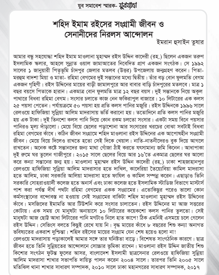আমার বন্ধু সহপাঠী শহিদ ইমাম মাওলানা মুহাম্মদ রইস উদ্দিন কাদেরী (রহ.) ছিলেন একনিষ্ঠ তর্কক ইসলামীক কল্যান, আহলে সুন্নাত ওয়াল জামায়াতের নি:স্বার্থ প্রাণ একনিষ্ঠ সংগঠক।