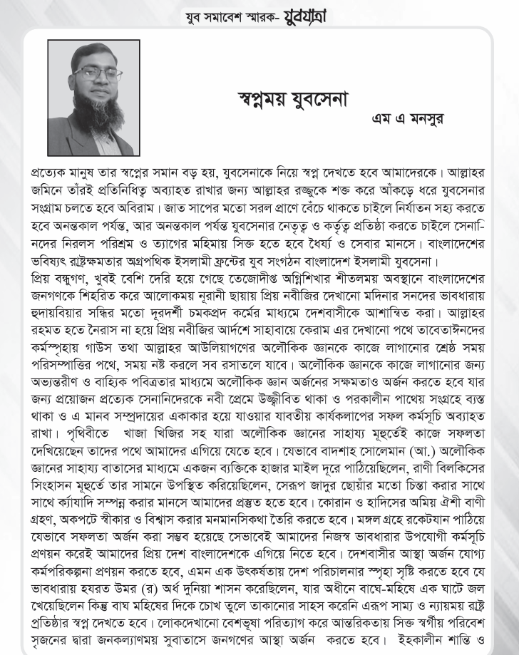 প্রত্যেক মানুষ তার স্বপ্নের সমান বড় হয়, যুবসমাজকে নিয়ে স্বপ্ন দেখাতে হবে আমাদেরকে। আল্লাহর জমিনে তাঁর প্রতিনিধিত্ব অব্যাহত রাখার জন্য আল্লাহর শক্তিকে শক্ত করে আঁকড়ে ধরে যুবকদের সংহত চলতে হবে অবিরাম। জাতি সাপের মতো সরল প্রান্তে বেড়ে থাকুক ধীরে নিবারণ সহ্য করতে হবে দূরদর্শীভাবে, আর অন্ধকার পথ পরিহার করে নেতৃত্বে সামনে প্রতিভা করতে হবে দেশকে। মন্দের বিরুদ্ধে পরিশুদ্ধ হয়ে ফাহিশা মহিশা লিপ্ত হতে হবে বৈত্যান্ত ও দোয়ায় মানিয়া। বাংলাদেশের ভবিষ্যৎ রাষ্ট্রক্ষমতা অলঙ্কৃত হবে ইসলামী ফ্রন্টের যুব গঠনের বাংলাদেশ ইসলামী যুবসেনা।